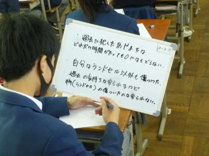 3組は「あの子のランドセル」という資料で,「いじめのない世界」を考えました。
