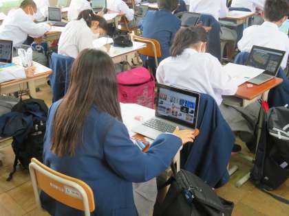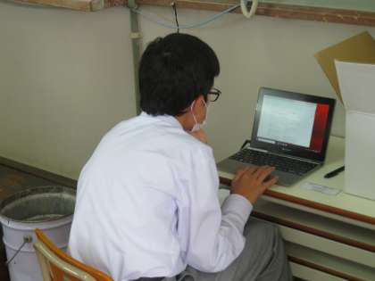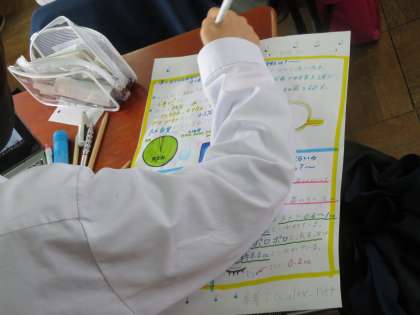 昨日に引き続き,ポスター作りです。色も着けられて,見た目も内容も良くなりつつあります。早く出来上がった生徒の中には,発表練習をしているところもありました。