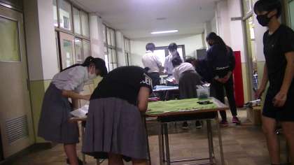 各クラス代表者が学級の旗の色を付けています