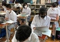 ・・・このような学習の組み立ての,「俳句を創作する」段階でタブレット端末を使い,web上の歳時記をうまく使いながら色々な季語を調べている写真です。