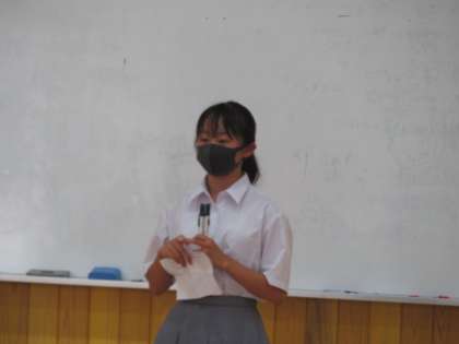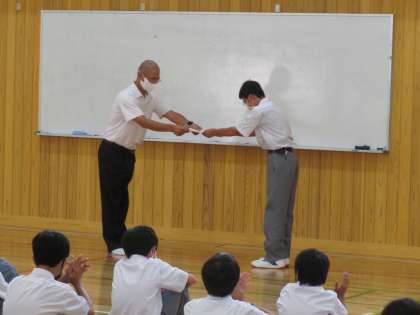 本日4限に学期末の学年集会を行いました。まずは生徒総会の時にリモートで見た学年目標の発表をもう一度披露してもらいました。学年メンバーの視線に緊張したようですが,頑張ってやり切ってくれました。その後,先生方が独自の視点選んだで8名の生徒に表彰が行われ,ノートや教科係,元気なあいさつや学級の仕事等,様々な表彰となりました。総括も評議員の代表が行うなど,教師主導ではなく,評議員が主催となって行われた集会となり,今後の生徒たちの活躍に期待が持てる時間となりました。評議員のみなさん,ありがとうございました。