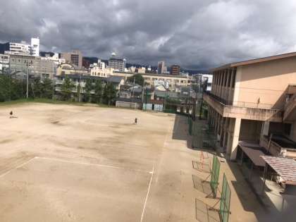 グランドは所々に水たまりが残っていましたが,次の体育でソフトボールをするために,体育の先生と教育実習生の2人でグランド整備を黙々と続け,1時間後には見事なダイアモンドが2面出来ました。