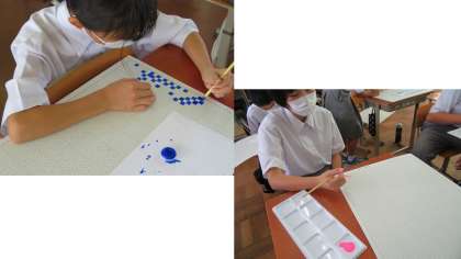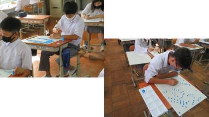 本日6限,1年生は文化祭に向けての学年制作に取り組んでいます。調べ学習もほぼ終わり,ほとんどの生徒がデジタルアートに取り掛かりました。本時より着色作業も始まっています。1cm四方のコマをひたすら塗り,クラスで一つの絵を完成させます。