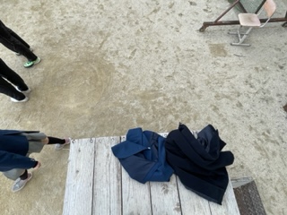 「暑い!!」と朝礼台に置かれたブレザーや上着が,楽しい昼休みの様子を物語っているようです。