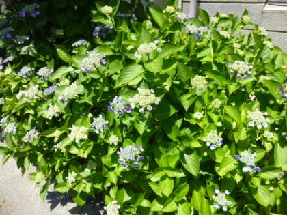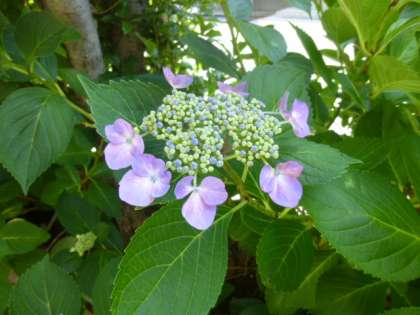 写真の様に,花の中心に蕾のような花が集合し,その周りにガクと呼ばれる葉が変化した部分(花ではない)がついているのは,ガクアジサイ(額紫陽花)といわれる種類です。