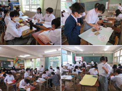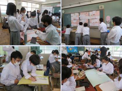 いよいよ大詰めです。みんなで協力し,ポスター作りも完成に近づいてきました。この学習中にも,教え合ったりアイディアを出し合ったり,優しさあふれる場面も見られます。次は発表に向けて原稿づくりになります。発表もしっかり成功させましょう。