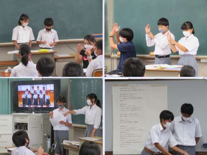 今日から手話コーラスの取組が始まりました。文化委員が今日まで本当に一生懸命、手話えを考えたり、映像を作ったりして取り組んできました。その姿を見てみんなも真剣に、丁寧に手話を覚えていました。みんなで楽しみながら「サザンカ」を奏でていきたいですね。