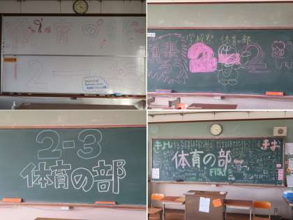 10月の行事学校祭「体育の部」が閉会しました。競技の様子は既にたくさん挙げられていますが,生徒たちは前日からクラスの団結を高めようとホワイトボードや黒板にメッセージを書いていました。当日もここに思いを書き加えていたようです。あたたかい雰囲気で最後まで行事を楽しんでくれたみなさんに感謝です。「学習発表の部」も頑張りましょう!