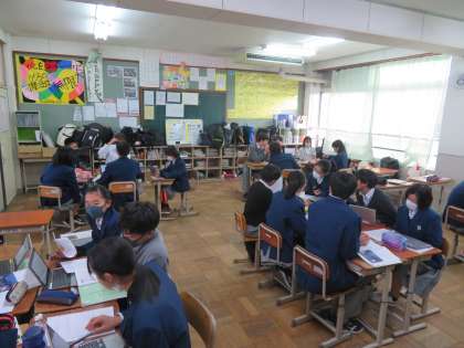 2年生の道徳も終盤に差し掛かりました。2年4組では「郷土愛」について考えました。実際に自分に関わる場所について調べ、その魅力を班の仲間に伝えました。校区の町内から他府県まで様々な場所の事を見聞きする中で、「この環境を残すにはそうすれば良いかを考えたい。」「故郷の良さを自分の子供にも伝えていきたい。」などの感想を聞くことができました。