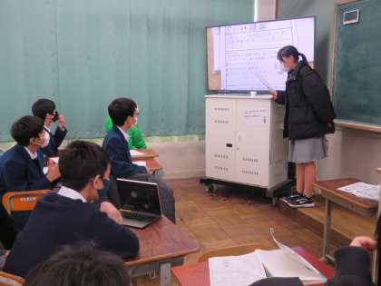 興味のある職業を調べ、各クラスで発表会を行いました。先日、2年生のチャレンジ体験のポスターセッションに参加し、たくさんのことを学ばせてもらいました。今日は、発表方法の工夫、伝え方などしっかりとその学びを生かせていましたね。お疲れさまでした。