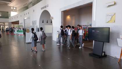 資料館で展示物を見て、学習しています。熱心に見ています。