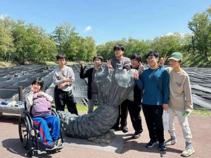 出発時は肌寒い気候でしたが、天候も回復し、かなり気温が上がってきました。わさびソフトクリーム、大人気です。まもなくわさび農園を出発し、白馬スキージャンプ場へ向かいます。