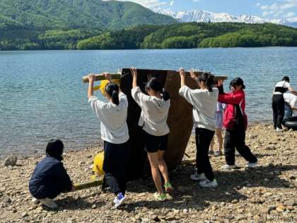 いかだづくりを選択した生徒たちは、同じく青木湖畔で活動に取り組みました。悪戦苦闘しながら、グループで協力していかだを組み立てました。