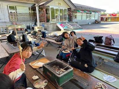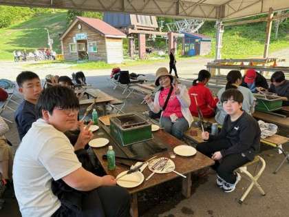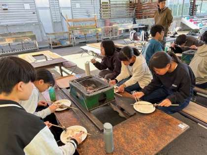 自分たちで釣った魚をハサミでさばき、塩焼きにして美味しくいただきました。炭火焼きのニジマスの味は格別でした。