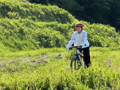 ゲレンデをゆっくり下りながら、大自然の中で自転車を操る楽しさを存分に味わいました。途中、段差のあるところもバランスをとりながら無事にゴールまで辿りつきました。気候も良く、絶好の自転車日和でした。
