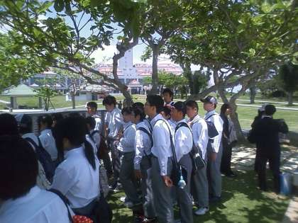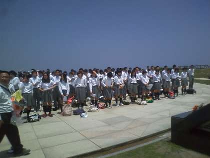 平和のセレモニー,平和の宣言のあと,ガイドさんの話を聴いています。