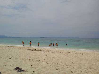 グループごとに色々体験をしています。マリン体験は値打ちがあります。白い砂にマリンブルーがよく合います。男子生徒はライフジャケットを着けて泳いでいます。伊江島最高峰172メートルの城山(ぐすくやま)にも登りました。元気に過ごしています。