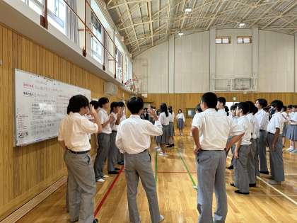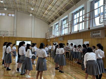 10月17日(木)、18日(金)に予定されている学習発表会に向けて、本日より文化委員会主催の全校手話コーラスの練習が始まりました。昼休みに短時間、生徒の有志が集合しての練習ですが、初日である本日は大変多くの生徒が参加し、音源に合わせて歌いながら手話の練習に取り組みました。まだまだ難しく感じている生徒もいるようでしたが、参加生徒全員が楽しそうに、大きな声で合唱してくれました。学習発表会までの限られた期間で、手話も、歌も、生き生きと表現できるよう、練習を重ねてください。企画してくれた文化委員のみなさん、ありがとうございます。