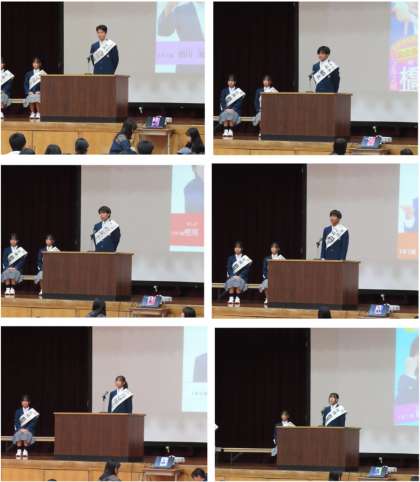 立会演説会では、候補者一人一人が二条中学校をどのように進化させていきたいかについて、公約も含めた抱負を語りました。どの演説も素晴らしく、甲乙つけがたいものでした。その後、学級ごとに体育館で投票を行いました。選挙の結果、当選した候補者に対し、担当教員から生徒会本部役員として必要な心構えや今後の予定などについて説明がありました。