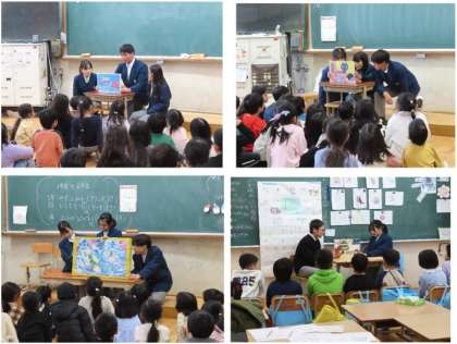 事前に準備した「おふろだいすき!ぷっぺ」「ももたろう」「たのしいクリスマスのじゅんび」「せつぶんとおに」の作品を、声色を変えたりしながら1年生たちにわかりやすく読んで聞かせました。多くの1年生がお話に引き込まれるようにしながら聞いてくれ、お話が終わるとどのクラスでも大きな拍手が沸き起こりました。