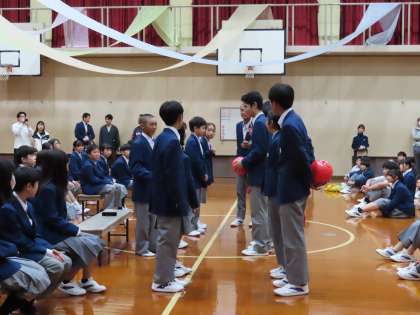 生徒会のオープニングの後、新入生にも中学校の様子がよくわかるような学校生活クイズ、委員会活動の紹介、部活動の紹介を楽しく、しっかりと行ってくれました。くす玉での歓迎も嬉しいものでした。2・3年生の頼もしい姿を見て、新入生もこれから本格的に始まる学校生活が楽しみになっている様子が窺えました。