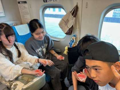 修学旅行団は新幹線で静岡県を通過中です。みんな思い思いに楽しい時間を過ごしています。残念ながら天候が良くなく、富士山は見えませんでした。