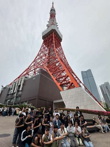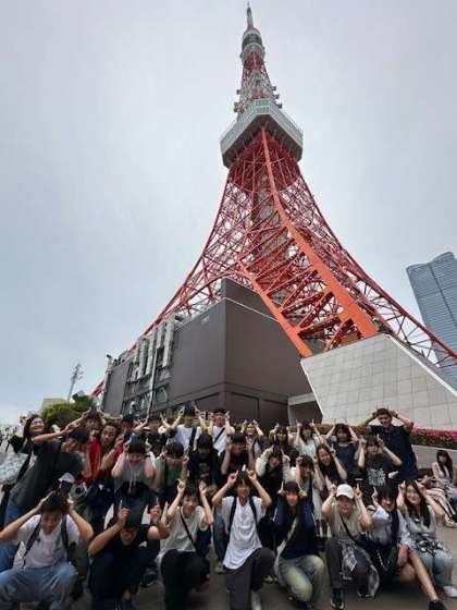 修学旅行団は東京タワーに到着しました。これから展望台に上がります。集合写真も撮りました。