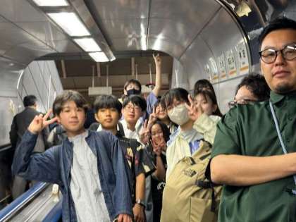 修学旅行団は先ほどホテルを出発し、電車で東京ディズニーランドへ向かっています。通勤ラッシュ時間帯ですが、大きなトラブル等なく無事に移動しています。