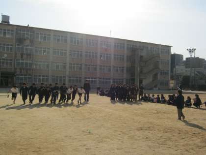 保健体育の授業では,持久走が始まりました。グラウンドを10周します。女子は内回り1.5km,男子は外回りで2km,自分の限界に挑戦します。2交代制で,見学の時間は精一杯の声で応援をします。最後の一人も,みんなからの応援を受け「力走」です。ゴールの瞬間には,みんなから大きな拍手を受けていました。