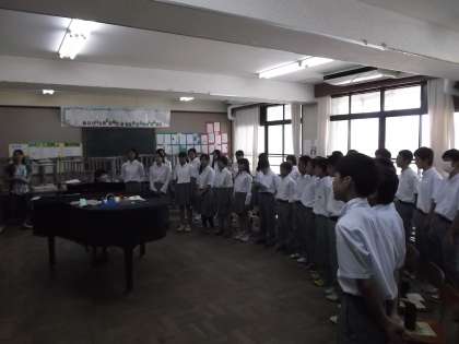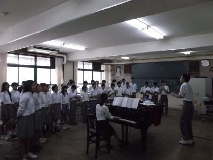 8月30日から教育実習が始まっています。日々の実習通して,教師として必要な資質や授業をする上での大切なことを学んでいます。今日は,1年生で音楽の研究授業が行われました。とても大きな声で歌い,みんな楽しそうに授業を受けていました。