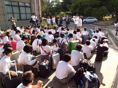 午前7時集合完了。出発式では,修学旅行実行委員長のあいさつや3日間お世話になる添乗員さん,カメラマンさんなど紹介がありました。保護者の皆様も多数お見送りいただき,ありがとうございました。