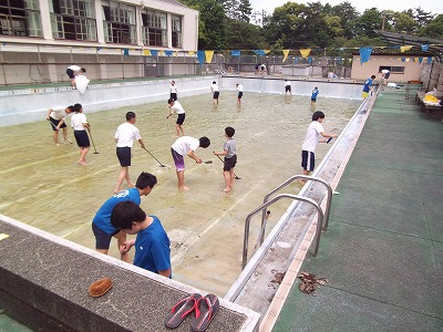 水泳部では,午後からの練習に先立ち「プール掃除」を行いました。野球部2年生や女子バレー部も大勢参加をしてくれました。おかげで予定時間よりかなり早く,きれいになりました。ごくろうさまでした。プール開きは19日(火)の予定です。