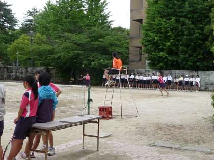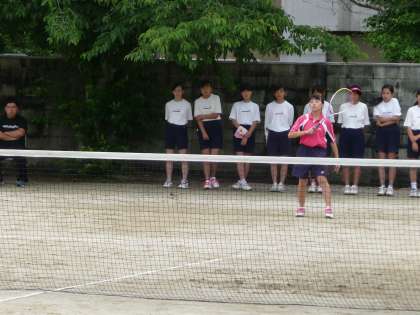 曇り空の中,本校のテニスコートで,ソフトテニス部が他校に来ていただき,練習試合を行いました。3年生の選手が一生懸命,集中して頑張っていました。1年生の応援も少しずつですが,大きな声が出るようになり,とても聞いていてたのもしく感じました。選手も1年生の応援も,夏の大会に向けて頑張って欲しいです。