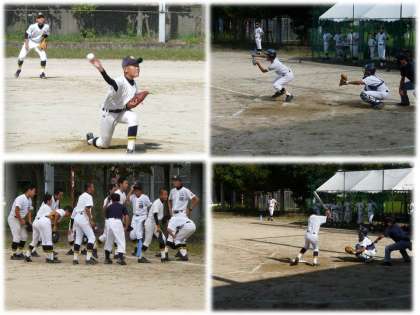 野球秋季大会「予選リーグ」第3試合目が,午前9時より伏見区の洛水中学校で行われました。対戦相手は,合同チーム(洛水中・桃陵中・京都文教中)です。結果は,7対3で勝利しました。これで,予選リーグの対戦結果は,2勝1敗となりました。