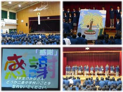 5・6限に3年生を送る会を行いました。15日の卒業式では,在校生は代表のみの参加なので,全校生徒が集まるのは今日が最後です。生徒会が中心となり,感謝の思いを込めて計画的に準備を進めてきました。