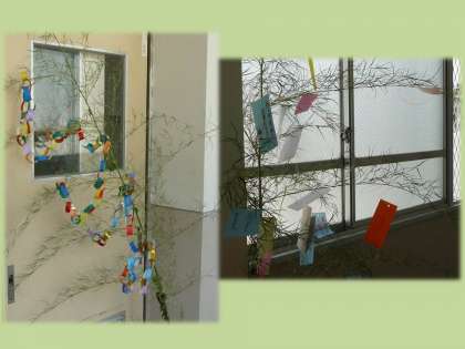 校内にも,教室の前に,願い事を書いた短冊を吊るした笹(竹)の七夕飾りがあります。今夜は,少し曇り空でお星さまが見えるかどうか心配ですが,みなさんの書いた願い事が叶うといいですね。