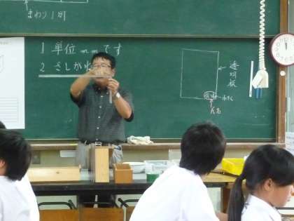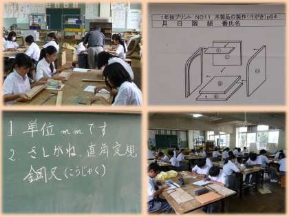 1年生の技術家庭科の木材加工で,「シースルーポケットスライダー」(小物入れ)を作製します。今日の授業は,大工さんなどが使用する「さしがね」という金属の直角定規を用いて,木材に鉛筆で線を引く授業でした。生徒達は,普段使用したことのない「さしがね」の使い方を,教科担任の先生の指導の下,しっかりと説明を聞いていました。今から出来上がりが楽しみですね。