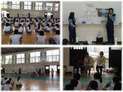 上京警察署から2名,上京地域交通安全活動推進委員2名の方に来ていただいて,夏休みを前に交通安全や自転車の正しい乗り方についてお話をしてもらいました。