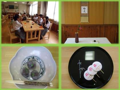 お軸は赤穂浪士ゆかりのお寺山科瑞光院のご住職前田宗源師のお筆で「知足」,学校に咲いている底紅の木槿を岩田糸子作のガラスの花入れに入れて,琉球堆錦(ついきん)のハイビスカスの香合を荘りました。お菓子は亀広脇さんの瀧のもみじと祇園祭りの団扇(干菓子)をいただきました。
