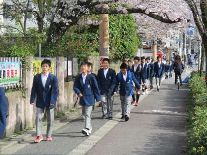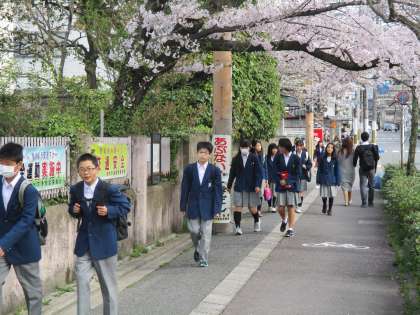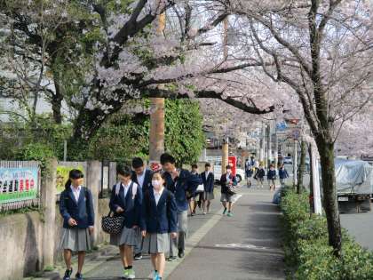 校内の桜の木の枝が学校の外の道路を覆って、まるで桜のトンネルのようになっています。その中を子どもたちが登校してきます。