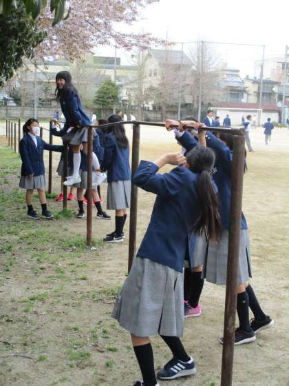 1年の女子たちでしょうか。鉄棒で遊んでいます。