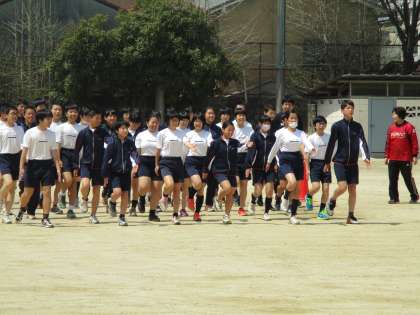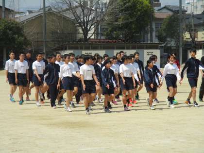 グランドで集団行動(行進)の練習です。見事、きちっと歩けます。