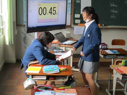 急ににぎやかな声が聞こえてきたので見に行くと、英語の時間に習ったことをペアワークで復讐をしている場面でした。