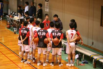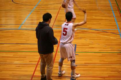 ハーフタイムに、ゴール下でのプレーについて、監督からアドバイスを受けます。