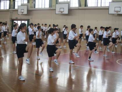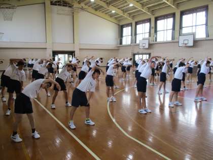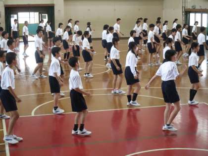 講堂で、おそらく体育大会の準備運動で行うダンスです。