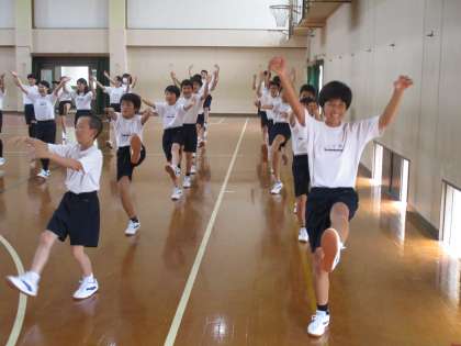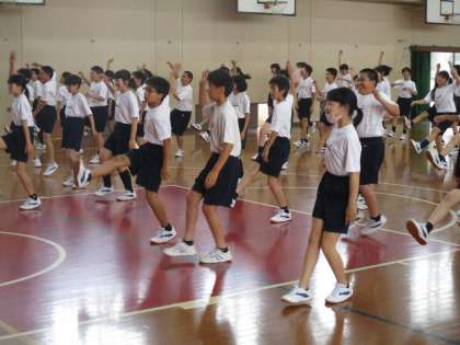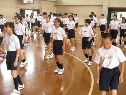 1年は全員で体育です。講堂で準備運動ダンスの練習です。