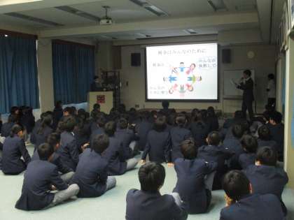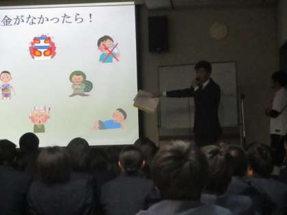 税務署の方に来ていただいて、3年生対象に「租税教室」を開きました。硬いイメージがある税金の話ですが、プレゼンテーションソフトを使って、楽しく分かりやすく話をしてくださいました。もしも税がなかったら、今受けているいろいろなサービスが受けられなくなり、日常生活が不便になることなど、納税の大切さを丁寧に教えてくださいました。国民の三大義務の一つである、納税の義務についても少し理解できたかな?