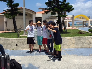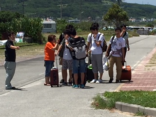 午前中の民泊先での体験活度を終えて、午後からのマリン体験の会場である安座間サンサンビーチに集まってきました。ここで退村式の後マリン体験です。お世話になった民泊先の方とのお別れです。