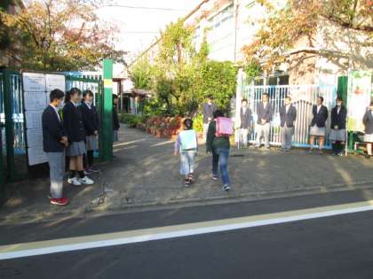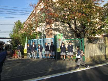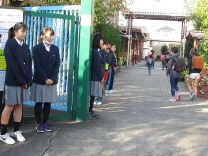 11月8日朝、大将軍小学校で小中合同あいさつ運動がありました。今回は大将軍小学校児童会と北野中学校生徒会が合同であいさつ運動を行いました。生徒会役員選挙後初めてのあいさつ運動で、少し中学生も緊張していたようです。