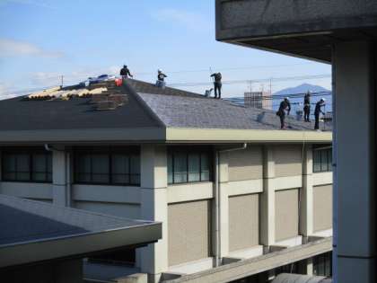 台風21号のために第2体育館の屋根が大きく損傷してしまいました。工事をすることはずいぶん早くから決まっていたのですが,台風の影響があちらこちらに出ていたため,業者さんの手が回らずようやく今日から工事にかかれました。完成したらまたお知らせします。